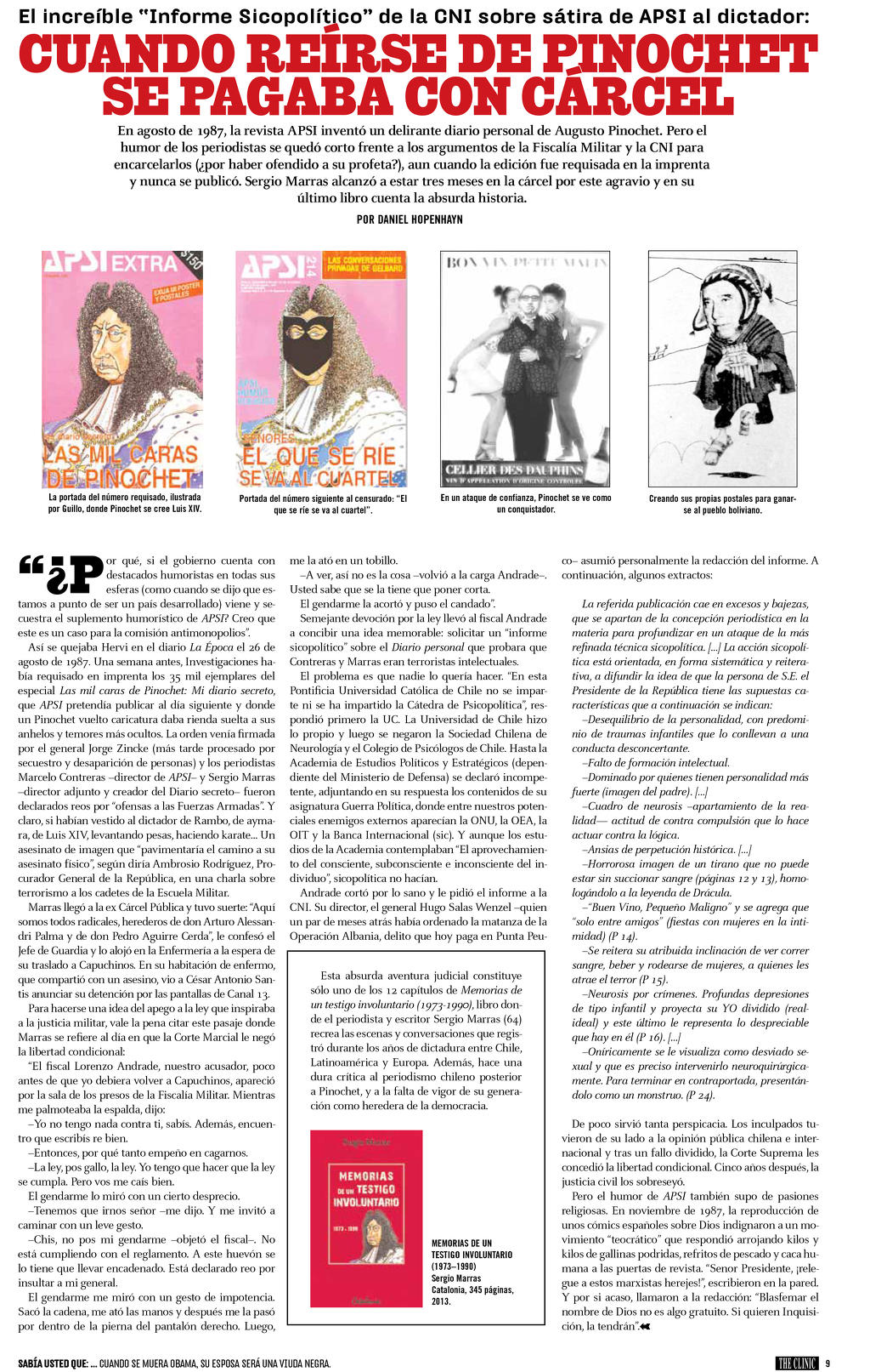 Así se quejaba Hervi en el diario La Época el 26 de agosto de 1987. Una semana antes, Investigaciones había requisado en imprenta los 35 mil ejemplares delespecial Las mil caras de Pinochet: Mi diario secreto, que APSI pretendía publicar al día siguiente y donde un Pinochet vuelto caricatura daba rienda suelta a sus anhelos y temores más ocultos. La orden venía firmada por el general Jorge Zincke (más tarde procesado por secuestro y desaparición de personas) y los periodistas Marcelo Contreras –director de APSI– y Sergio Marras –director adjunto y creador del Diario secreto– fueron declarados reos por “ofensas a las Fuerzas Armadas”. Y claro, si habían vestido al dictador de Rambo, de aymara, de Luis XIV, levantando pesas, haciendo karate... Un asesinato de imagen que “pavimentaría el camino a su asesinato físico”, según diría Ambrosio Rodríguez, Procurador General de la República, en una charla sobre terrorismo a los cadetes de la Escuela Militar. Marras llegó a la ex Cárcel Pública y tuvo suerte: “Aquí somos todos radicales, herederos de don Arturo Alessandri Palma y de don Pedro Aguirre Cerda”, le confesó el Jefe de Guardia y lo alojó en la Enfermería a la espera de su traslado a Capuchinos. En su habitación de enfermo, que compartió con un asesino, vio a César Antonio Santis anunciar su detención por las pantallas de Canal 13. Para hacerse una idea del apego a la ley que inspiraba a la justicia militar, vale la pena citar este pasaje donde Marras se refiere al día en que la Corte Marcial le negó