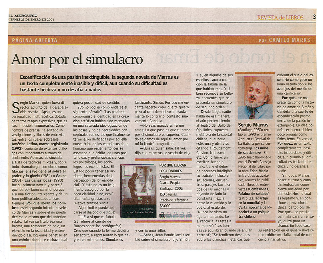 Sergio Marras, quien fuera director adjunto de la desaparecida revista "Apsi", es una personalidad multifacética, dotada de tantos rasgos expresivos, que es casi imposible enumerarlos. Como hombre de prensa, ha editado investigaciones y libros de entrevistas, entre los cuales sobresale América Latina, marca registrada (1992), conjunto de extensos diálogos con importantes autores del continente. Además, es cineasta, artista de técnicas mixtas y, sobre todo, dramaturgo, con obras como Macías, ensayo general sobre el poder y la gloria (1984) o Sauna (2001). Las ganas locas (1990) fue su primera novela y pareció que iba por buen camino, porque era una ficción interesante y de un tono político adecuado a esos tiempos. Por qué lloran los hombres es el segundo intento novelesco de Marras y sobre él no puede decirse lo mismo que del anterior relato. Tal vez su título sea una broma, una tomadura de pelo, un ejercicio en la oscuridad y entendiéndolo así, logremos penetrar en una crónica donde se rechaza cualquiera posibilidad de sentido.